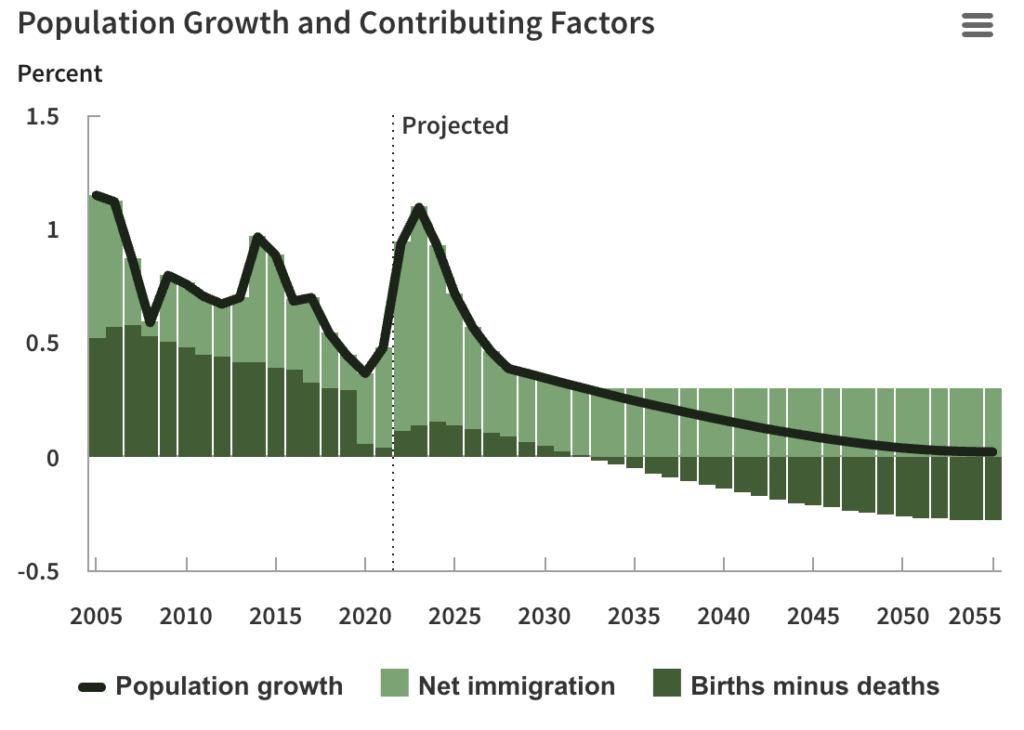 There is another structural force that strengthens the post-2030 debt-risk argument: the country is aging into higher entitlement costs at the same time population growth is slowing sharply.