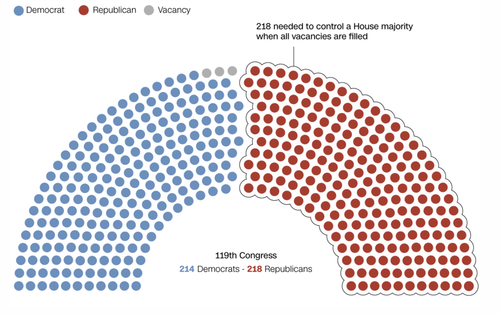 As of January 2026, the House consists of 218 Republicans, 213 Democrats, and 3 vacant seats. Republicans retained their majority in the 2024 elections, resulting in one of the narrowest margins in modern congressional history. You can see this in Figure 1 below: